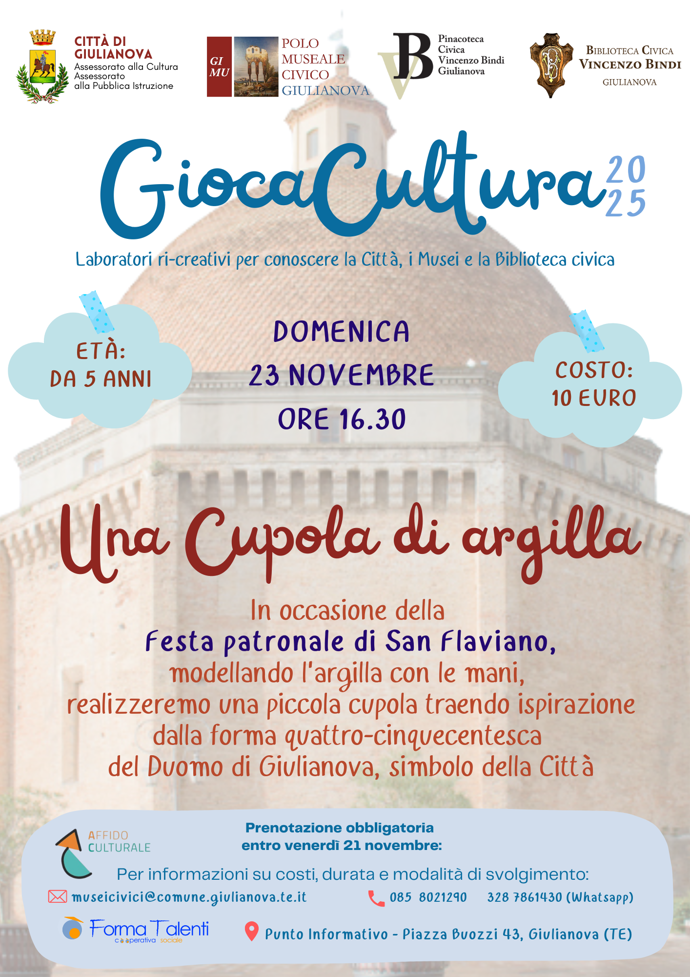 Domenica 23 novembre, alle ore 16.30, i bambini e le bambine dai 5 anni, potranno vivere un’esperienza unica con il laboratorio di manipolazione “Una Cupola di argilla”, ispirato a uno dei monumenti più emblematici di Giulianova: la grande cupola quattro-cinquecentesca del Duomo di San Flaviano.