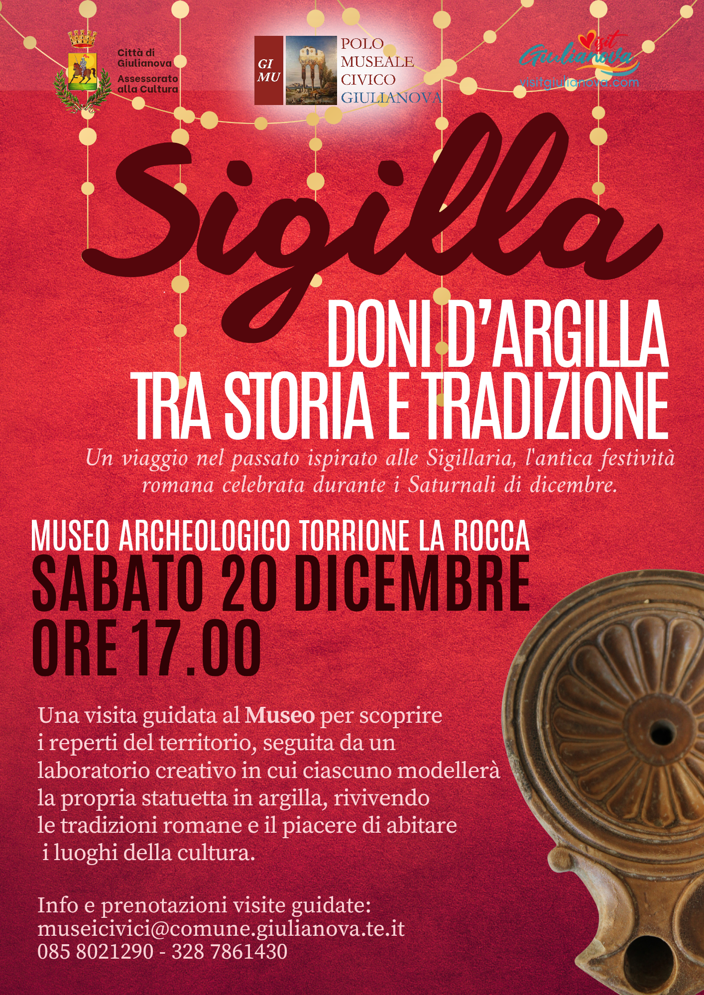 Alle ore 17, il Museo civico archeologico Torrione “La Rocca” si trasformerà in uno spazio di racconto e di sperimentazione, ispirato alle Sigillaria, antica festività romana inserita nel ciclo dei Saturnali, celebrati nel mese di dicembre come momento di scambio, convivialità e doni simbolici. L’appuntamento si aprirà con una visita guidata al museo, per conoscere da vicino le testimonianze archeologiche di Castrum Novum. A seguire, grandi e piccoli saranno protagonisti di un laboratorio creativo, durante il quale realizzeranno una statuetta in argilla, rievocando l’antica usanza romana di donare le sigilla: piccole figure fittili cariche di significato, augurio e condivisione.