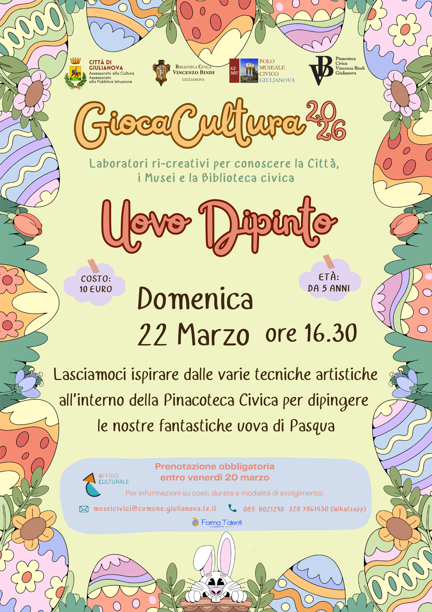 Uovo dipinto è il nuovo coloratissimo appuntamento di GiocaCultura a Giulianova che si svolgerà domenica 22 Marzo, alle ore 16.30, quando i piccoli esploratori d’arte, scopriranno quante diverse tecniche artistiche caratterizzano le opere della collezione della Pinacoteca casa museo “Vincenzo Bindi”. Svolgendo un breve viaggio tra le ricche sale della Casa Museo i partecipanti si ispireranno a paesaggi, disegni e oggetti preziosi traendo ispirazione per ricreare una delle più antiche produzioni artistiche della storia, che attraversa secoli e civiltà: le uova dipinte. Il laboratorio proseguirà con la realizzazione di uova decorate utilizzando la tecnica artistica preferita sotto la guida attenta di Giuseppina Michini.